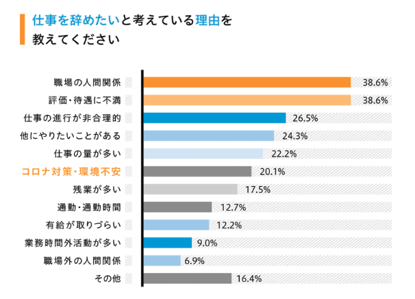 さらに、同アンケートによると、辞めたいと答えた方の20.1%が企業のコロナ対策に起因しているという結果が出ています。