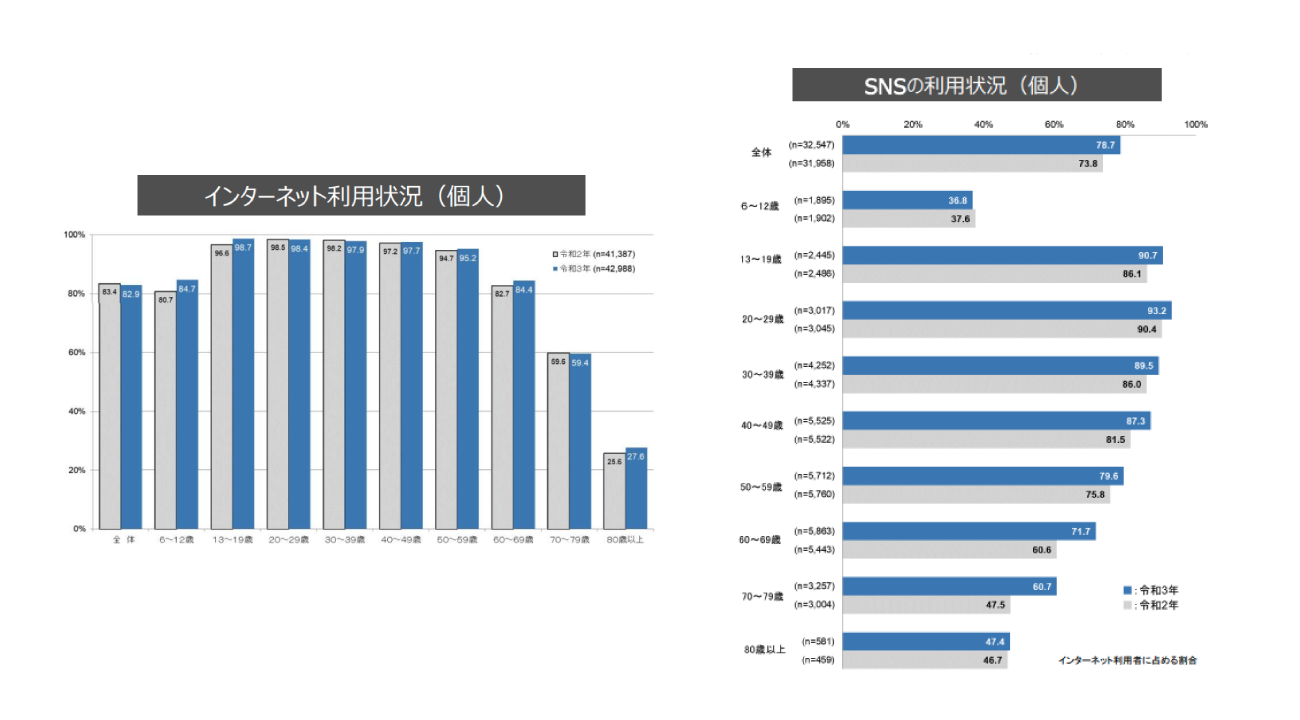 総務省の調べによると、2020年におけるインターネット利用者の割合は13〜59歳までの各階層で9割を超えており、さらにSNSの利用率は全体の7割以上に上がっています。(※1)