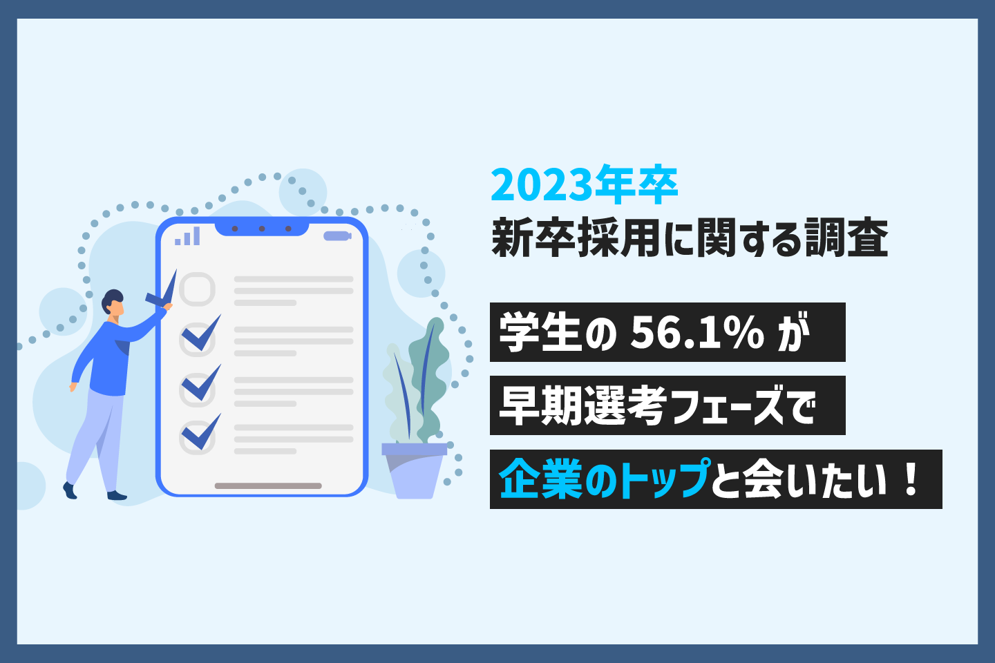 今回の調査では、学生が社長・経営者に実際に会いたい選考フェーズは「説明会」が最多(56.1%)となり、学生は選考における早い段階から会社のトップである社長・経営者に会いたいと考えていることが分かりました。