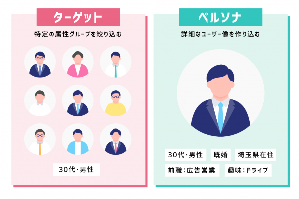 例えば、ペルソナは「30代・既婚男性、埼玉県在住、広告営業の経験あり、趣味:ドライブ」といったように詳細なユーザー像を作り込むのに対し、ターゲットは「30代・男性」といった具合で特定のグループを絞り込みます。