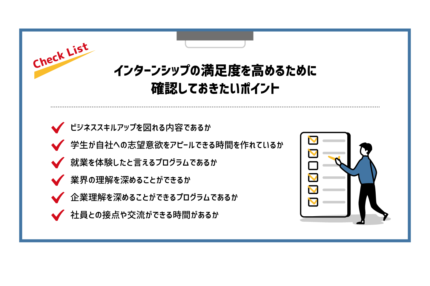 学生が「参加してよかった」と思えるようなインターンシッププログラムの設計を心がけましょう。