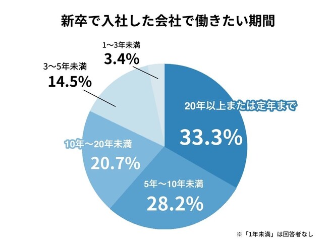 ・新卒で入社した会社で働きたい期間は「20年以上または定年まで」(33.3%)が最多