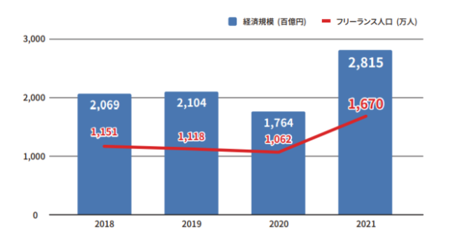 ランサーズ株式会社の「フリーランス実態調査」によると、副業を解禁する企業が増加し「副業元年」と言われた2018年と比較して日本のフリーランス人口は500万人以上増加し、2021年には1,670万人になったことがわかりました。(※1)