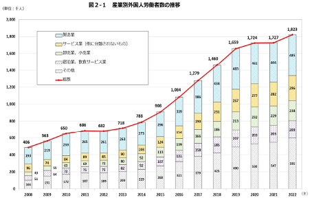 外国人労働者数は1,822,725人で、前年比95,504人増加し、届出が義務化された平成19年以降、過去最高を更新。対前年増加率は5.5%と、前年の0.2%から5.3ポイント増加しています。