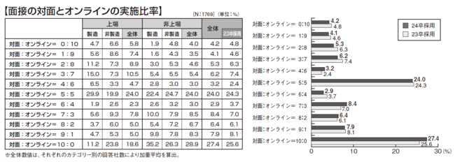 株式会社学情が企業・団体の採用担当者を対象に行った調査によると、面接の対面とオンラインの実施比率は、「対面のみ(対面:オンライン=10:0)」が前年を1.8ポイント上回り27.4%で最多に。次いで、「対面:オンライン=5:5」が24.0%で続いており、対面のみの実施へと切り替えている企業は増加傾向にあることがわかります。
