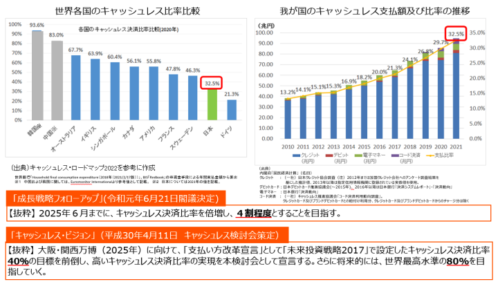 2018 年時点では、世界各国の水準と比較すると日本はキャッシュレス決済比率が18.4%と低く、「2025年6月までに 4 割程度」という目標を設定。将来的には、世界最高水準の 80%を目指していくこととし、キャッシュレスに係る各種取組を進めています。