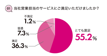これまでに20,000社以上の採用支援を行っており、多くの採用成功実績があります。これまでのノウハウをもとに市場の傾向を分析しながら、採用した人材に定着・活躍してもらうためのKPIやペルソナなどの採用計画や戦略を企業ごとに徹底的に練り、採用成功まで導きます。 また、当社のサービスを利用いただいたお客様へ満足度アンケートを実施、サービスの見直しを行っています。これまでに利用いただいたお客様の顧客満足度は「とても満足」(55.2%)、「満足」(36.3%)を合算すると91.5%の企業の方が満足と回答していることがわかります。