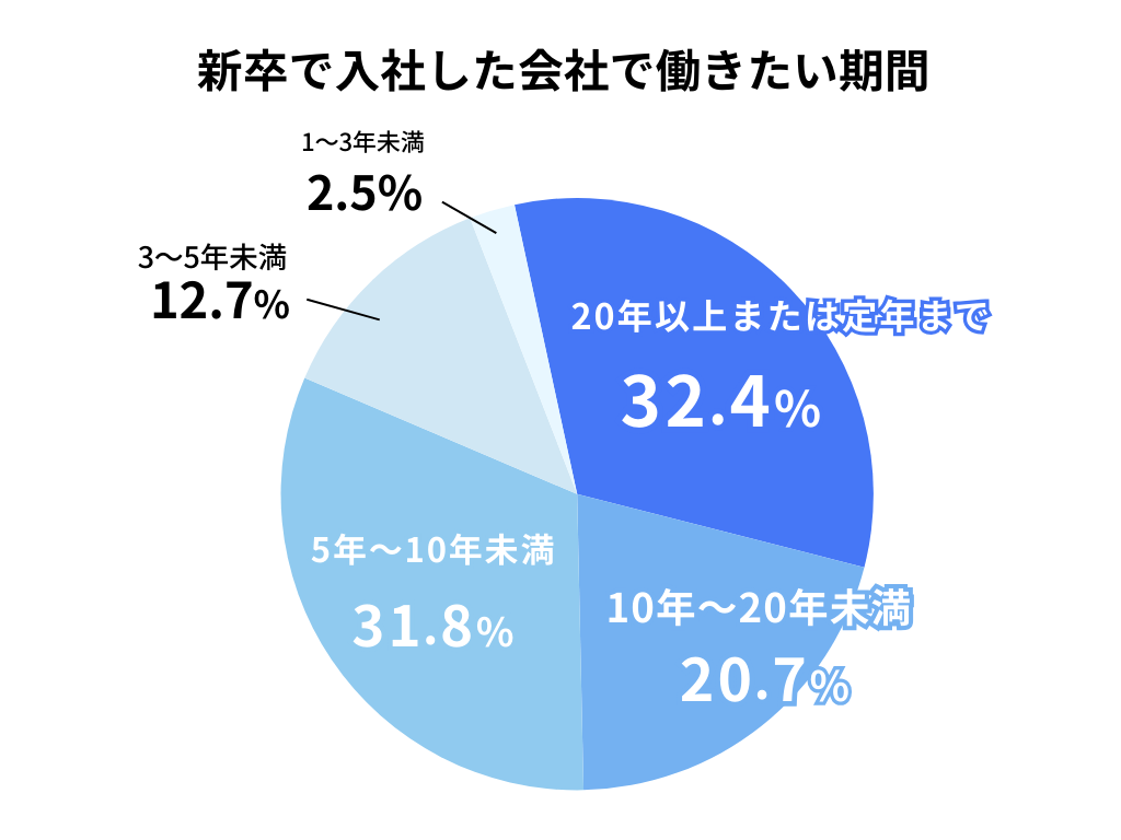 今回の調査では、入社した会社で働きたい期間は「20年以上または定年まで」(32.4%)が最多となり、「5年~10年未満」(31.8%)と「10年以上~20年未満」(20.7%)を合算すると84.9%が5年以上働きたいと考えていることがわかりました。