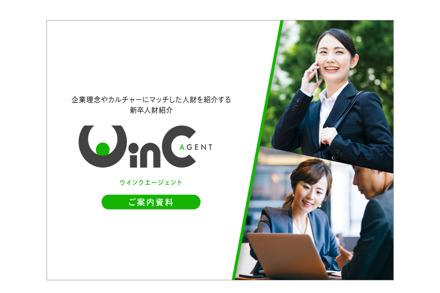 企業理念やカルチャーにマッチした人材をご紹介する新卒人材紹介サービス「WinC Agent(ウインクエージェント)」のサービス資料です。