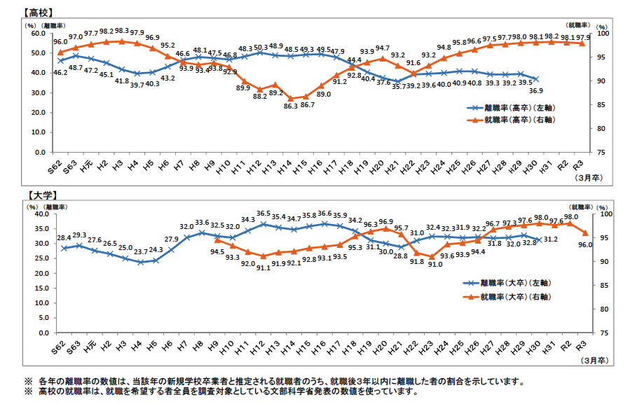 厚生労働省が2021年に報告したデータによると、2018年における入社3年以内の離職者は約3割となっており、離職理由の大きな要因は、「企業への期待と現実とのギャップ」とされています。 (※3)
