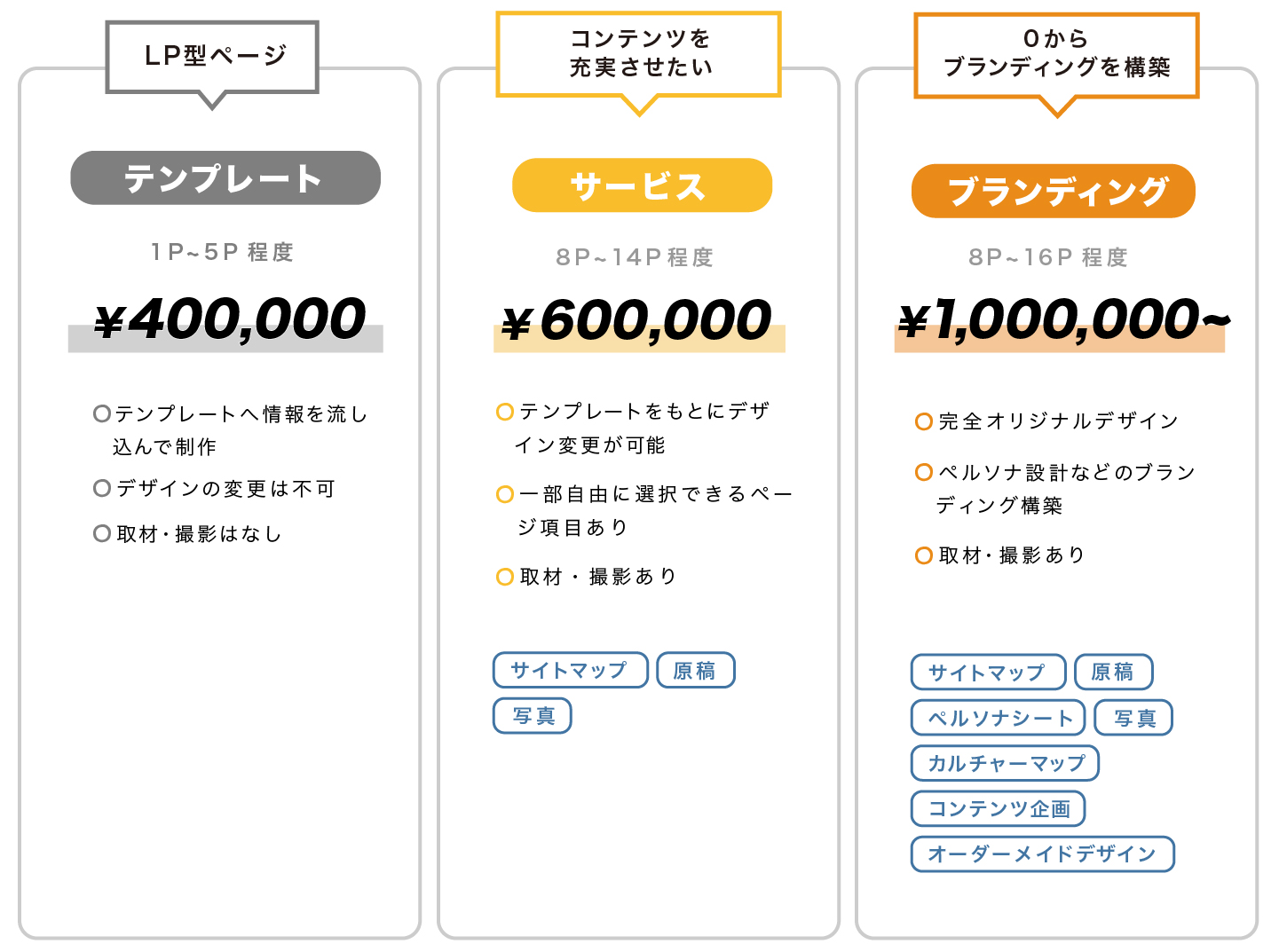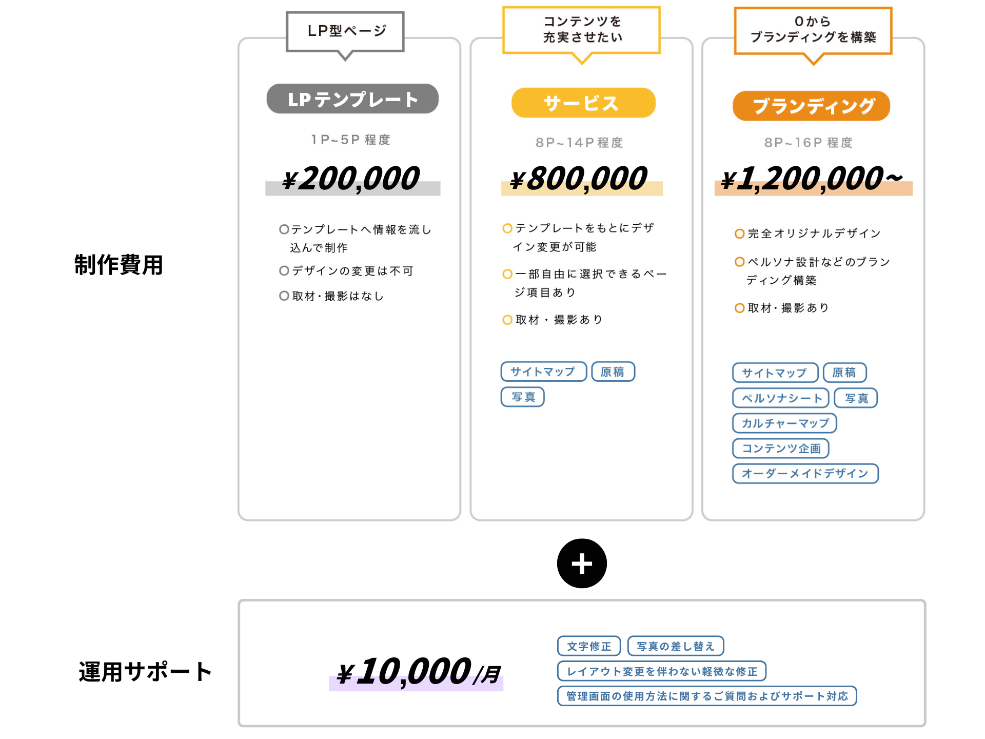 プレシャスパートナーズが作るホームページは、STUDIOで販売されているテンプレートをそのまま使用して作る「テンプレートプラン」と、テンプレートを軸に独自のデザインを行う「サービスプラン」、 ペルソナ設定からペルソナターゲットに刺さるコンテンツの企画を行い、蓄積したノウハウをもとに企業毎のオリジナルデザインを作成する「ブランディングプラン」の3種類のプランで制作を行っています。