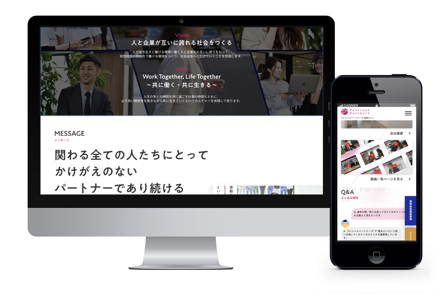 プレシャスパートナーズのホームページ制作は、採用ホームページやコーポレートサイト、ランディングページなど、採用領域にとどまらず、お客様の企業課題や目的に合わせた制作を行っています。 制作する際はターゲットやペルソナの設定、サイト企画、考案・取材、撮影まで一貫して対応するため、クオリティの高いWebサイトの制作が可能です。また納品後は管理画面をお渡ししますので自社完結型で運用できます。