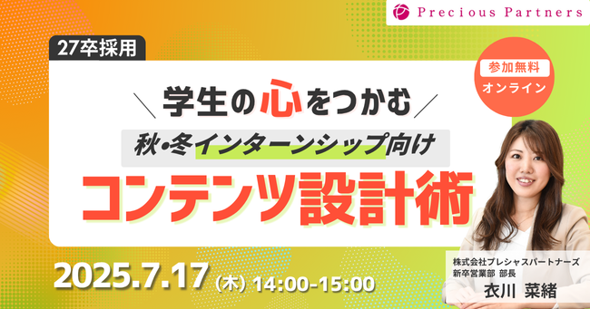 採用コンサルティング事業を行う株式会社プレシャスパートナーズ(本社:東京都新宿区、代表取締役社長 CEO:高崎 誠司)は、2025年7月17日(木)に『【27卒採用】学生の心をつかむ秋・冬インターンシップ向けコンテンツ設計術』をオンラインにて開催いたします。